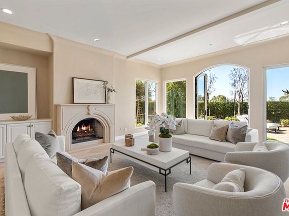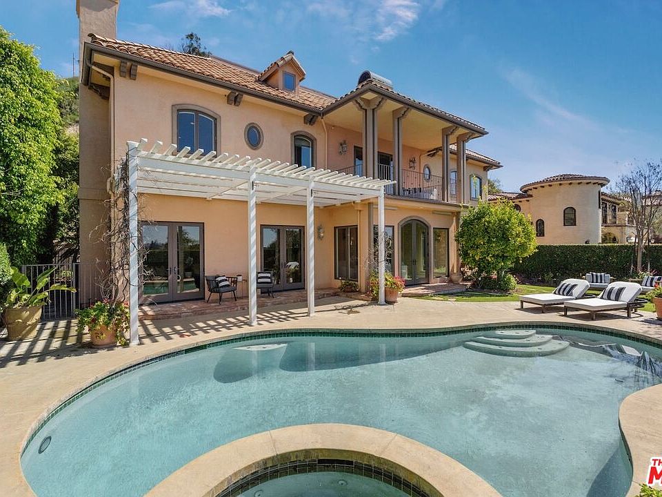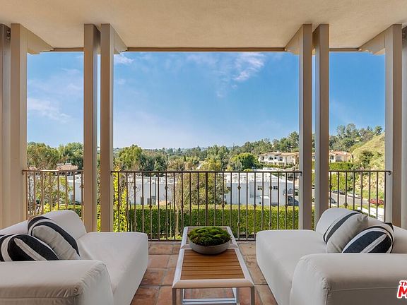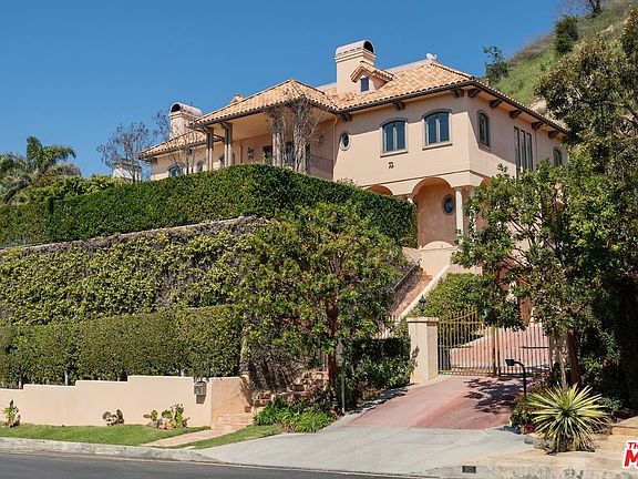 Gated villa, the private residence of Raquel Welch, the enduring Legend and Icon. Set within an exclusive enclave of a handful of beautiful homes known as Beverly Glen Circle.  The residence provides great volume of space, sunlight-filled rooms and desirable floorplan overlooking wide sky views facing south. Enter the stately Foyer opening to a Gallery Hall adorned with classic columns and a procession of attractive rooms. Living Rm with fireplace & French doors observe the serene views. Dining Rm and Family Rm all open to the romantically trellised entertaining terrace and Pool beyond.  Center Island Kitchen offers built-in casual dining and a nearby Office/ Study completes the main living level.  Primary Suite features fireplace, French doors opening to a covered terrace w/ view plus a large Bath Suite and double closets.  There are 3 more ensuite bedrooms plus an upper 3rd floor Bonus Room/ Gym or expansive storage closet room.  Lower level includes extra-large Garage w/ storage and staff rm or Gym w/bath and separate entrance.  The convenient walk access to the popular Glen Center retail & restaurant destination brings so much enjoyable value to this home and location.
