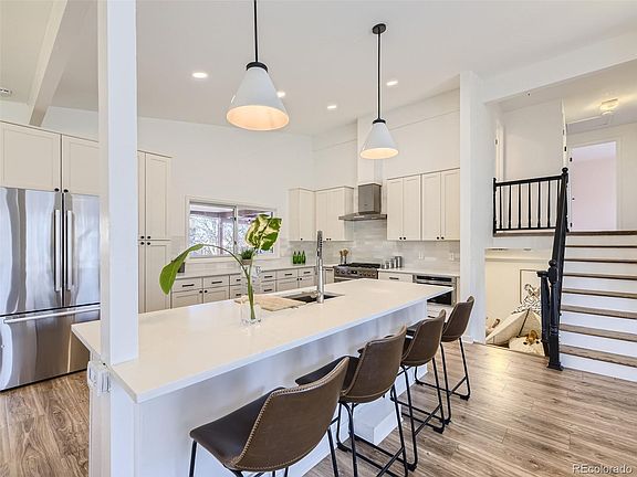 This tri-level home has been lovingly updated & thoughtfully remodeled. The open and bright chef-quality kitchen is a masterpiece featuring vaulted ceilings, upgraded finishes and stainless steel appliances - free-standing 36" Bosch 6-burner gas range with convection oven, Bosch undercounter drawer microwave & french door fridge. The heart of the kitchen is an expansive island crowned with a beautiful Quartz countertop. Gorgeous white shaker cabinetry with pull-out drawers & pantry space ensures your kitchen is as practical as it is stylish. An oversized stainless undermount sink makes cleanup simple. The great room's expansive windows & vaulted ceilings provide ample natural light, creating an open & vibrant living experience. Perfect for those who love to entertain - the seamless integration of the kitchen, dining & living room is inviting for hosting parties & everyday life. The primary bedroom is a personal haven, complete with an en-suite bathroom, double closets & private balcony access. The fully updated primary bath features stylish hexagon floor tiles, updated vanity, fixtures & an XL shower with a bench & double shower heads. Equally stylish is the full bathroom w/ deep tub, double vanity, classy tile and updated fixtures. The home's second living room is an ideal TV or rec area with space for an office setup. The unfinished basement offers room for growth. Generously sized, fully-fenced yard w/ in-ground sprinklers. A multi-level deck provides ample seating and entertainment space. Extended garage space for a work area. Nestled in a fantastic neighborhood, this home has the bonus of a peaceful park & playground at the end of the street. The Light Rail Dayton Station & Yale Station are nearby and proximity to I-25 & I-225 offers easy access to the DTC, Downtown & DIA. This home is a true gem, offering a perfect blend of elegance & functionality in a great Denver location.