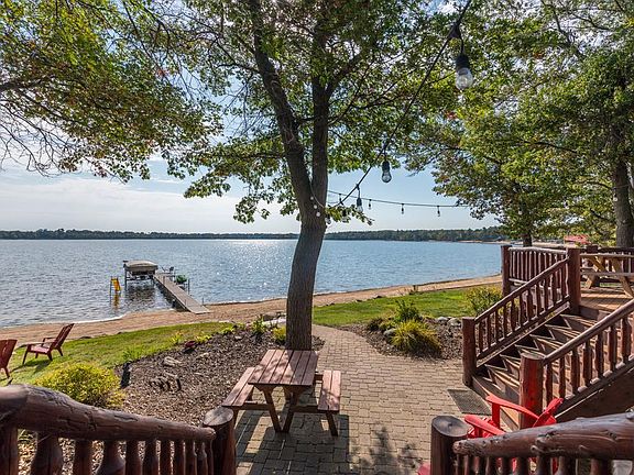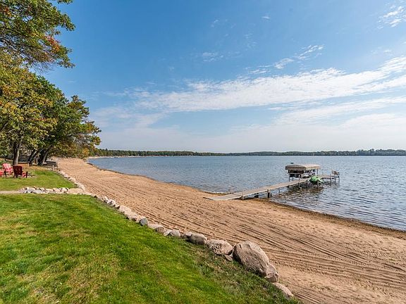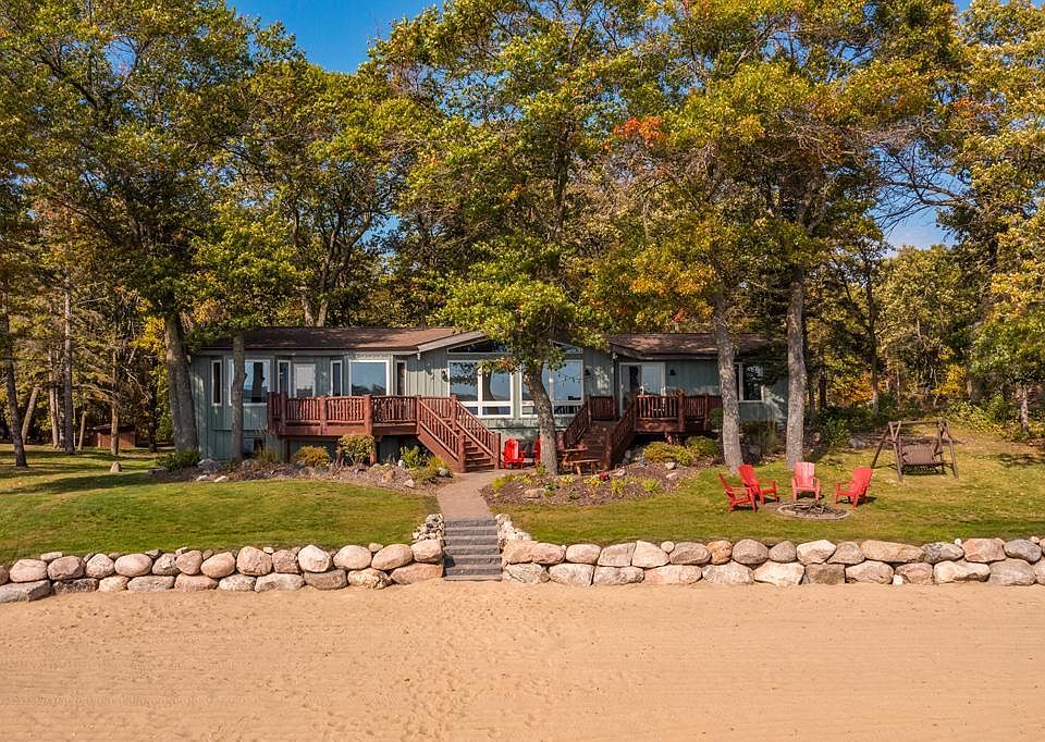 FUN IN-THE-SUN and THE BEST SUGAR SAND in the entire Lakes Area! This beautifully maintained 5BR-3BA home is nestled beneath a canopy of mature trees and offers a breathtaking storybook setting that features gentle elevation to 130’ of amazing sugar sand beach. The main level showcases lake views from nearly every room in the house and features many recent updates, an inviting open floor plan, a grand covered front porch, cathedral knotty pine T&G rustic beamed ceilings, a wall of lakeside glass, a spacious kitchen with plenty of cabinet space, luxury vinyl plank flooring throughout, a gorgeous wood-burning stone fireplace, a lakeside sunroom that opens to a large deck…sit and relax as you take in the peaceful panoramic views! The primary bedroom has a private ensuite bath-walk-in closet with access to a large lakeside deck. The walk-out lower level offers 3 bedrooms, a cozy family room, a new custom sauna with changing room-rain shower-Himalay stove and lighting. The newly built detached garage has a finished bunk room above that offers an additional 600 sq. ft. of living space for guests…with a private deck and a playful slide to whisk you down to the lake! The professionally landscaped grounds are spectacular…with a new retaining rock wall, stone stairs, gardens and irrigation system. A unique addition to this home is the hidden lakeside storage for your lake toys. Your search is over…this is the MEMORY-MAKING UP NORTH LAKE DESTINATION you have been looking for!