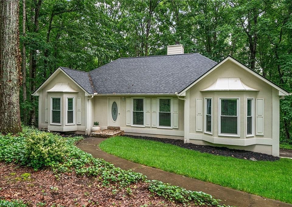 Welcome to Laurel Lake! This charming four-bedroom, two-bath ranch sits on a full basement and is beautifully situated on a wooded 1+ acre lot in a quiet, established neighborhood just minutes from downtown Ball Ground. Enjoy the peace and privacy of country living with the convenience of nearby shopping, dining, and easy highway access. This home features a vaulted great room with a cozy fireplace and a spacious kitchen with granite countertops and stainless steel appliances. Private primary bedroom has a beautiful bay window, his and hers closets, new quartz vanity, soaking tub and separate shower. Two secondary bedrooms located on the opposite side of the home share a full bath with new quartz vanity. The back deck offers a wonderful space to grill out and enjoy the outdoors. Downstairs is an additional bedroom and sitting area, or you could use it as a home office. The garage is enormous--large enough to fit four cars, a boat, or space for a workshop. Updates include: new roof 2021, new HVAC 2022, new exterior paint 2022, new windows 2022. This home has been meticulously maintained and is ready for you to call it home!