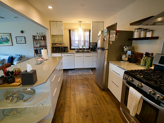 Beautifully updated contemporary home featuring an open-concept living, kitchen, and dining area with new oak floors throughout. The stunning kitchen includes a professional gas range/cooktop, stainless steel refrigerator, dishwasher, soft-close cabinetry, a large center island, upgraded lighting, solid-surface countertops, and a walk-in pantry with indoor washer/dryer hookups.