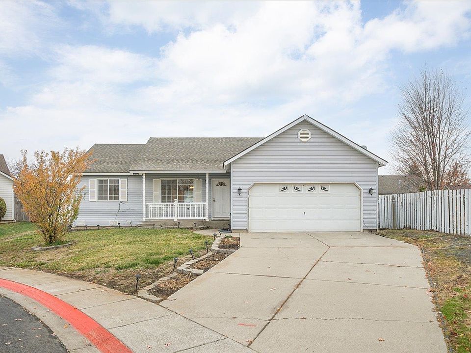 Welcome home to this inviting single-level charmer in the heart of Cheney. Bright, open, and thoughtfully designed, this 3 bed, 2 bath rancher makes everyday living easy. Vaulted ceilings and natural light create an airy sense of space, while the open kitchen with its breakfast bar keeps everyone connected. The primary suite offers a peaceful retreat with a private bath and walk-in closet, and two additional bedrooms provide space for family, guests, or work. Step through the sliding doors to a fully fenced backyard perfect for summer evenings or a quiet cup of coffee. With main floor laundry, no stairs, and a cozy front porch that welcomes you home, this is a place built for comfort and simplicity. Nestled on a quiet cul-de-sac close to schools, parks, and Fairchild AFB, this home captures the best of small-town warmth with the convenience of nearby Spokane amenities.