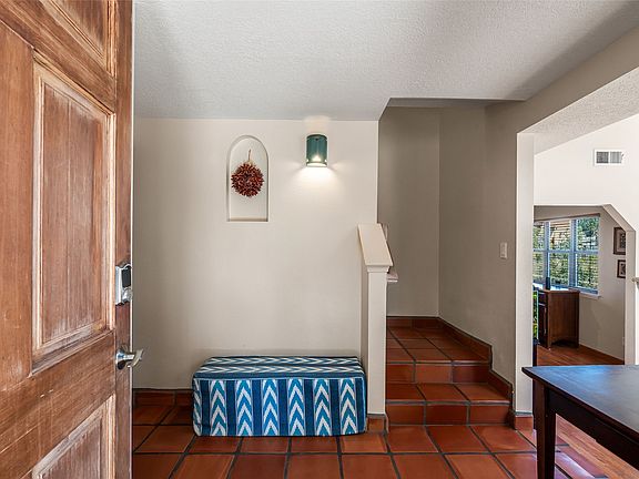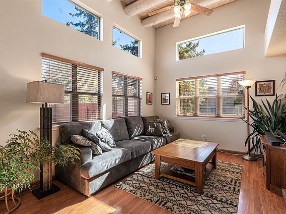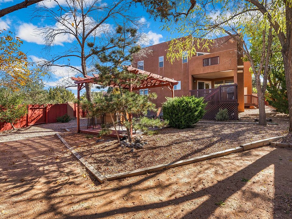 This spacious and comfortable two-story home sits on a unique private lot in the quiet and well-maintained Pueblos del Sol neighborhood. The large landscaped and fully-fenced backyard overlooks open space and features mature shade and apple trees, a pergola, and a patio that are perfect for entertaining, grilling, gardening or relaxing. The kitchen connects to the den for casual gatherings or morning coffee, with easy access to the backyard off the kitchen. The primary suite is the perfect retreat with a huge updated and expanded shower and separate bath, a large walk-in closet, and a peaceful balcony for catching the sunset or some mountain views. The living room has tons of natural light, high ceilings and vigas which provide the cozy comfort of home. There is plenty of room for your family, guests, or home office in this 2,286 square foot 4 bedroom and 3 bath home. An oversized and finished 2-car garage, tool shed, second refrigerator, giant kitchen pantry, laundry room, and ample closet space provide plenty of storage for all your needs and hobbies. Miles of neighborhood walking trails are accessible just a few steps from the house, and the brand new Pueblos del Sol playground is just down the street. Recent updates include a new water heater (2025), new upstairs blinds (2025), whole house parapet restoration (2024), and upstairs guest and primary bathroom remodel (2020).