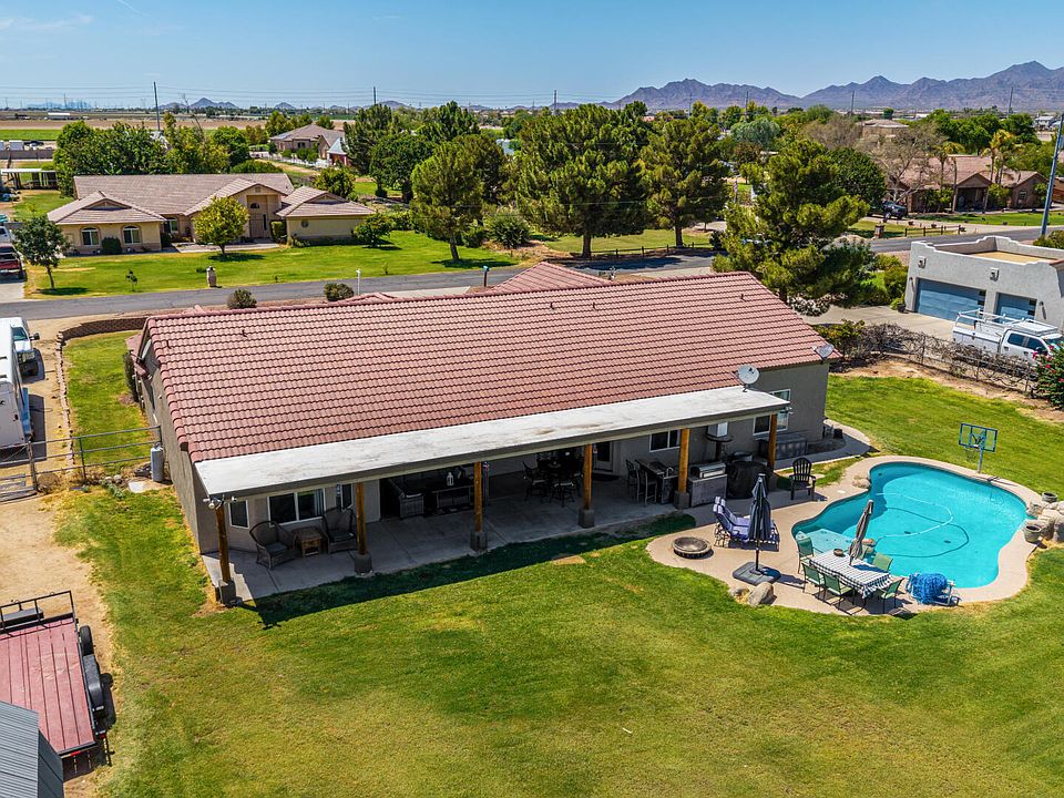 Welcome to 3013 S 201st Dr. in Buckeye! This 4 bed, 2.5 bath homesite on over an acre of irrigated land with lush green pastures and a refreshing turquoise pool. The spacious kitchen features an island and Corian countertops, and the family room showcases stunning Vega beam, with a gas fireplace to make it cozy. Horse lovers will love the 6-stall mare motel, tack room/storage, and ride-out access to nearby farm fields. Enjoy a newer AC (2023), tile roof, dual driveway, and 3-car garage. Covered patio for relaxing. Shared well, no HOA, and just minutes to the freeway and shopping. A true Buckeye gem!