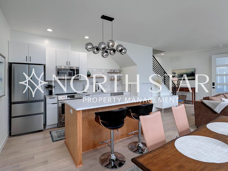Enter through an opaque front door into a bright and cheerful space that is the ideal clean fresh canvas to create your life's new chapter. The open lower level features a large center island for optimal entertaining flow or work space. Crisp white quartz counters and natural wood keep it light and airy.