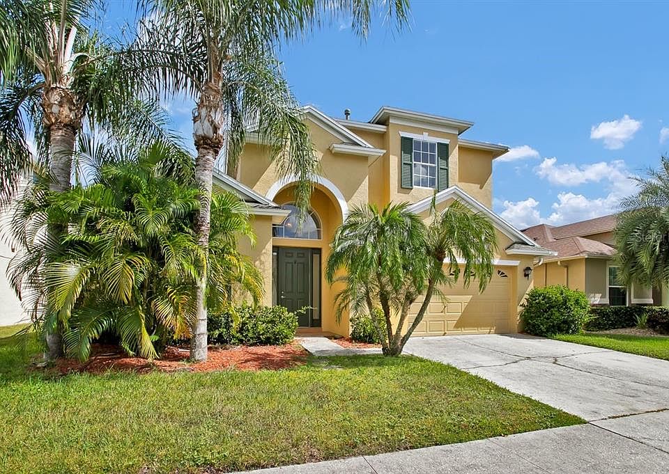 This stunning 3-bedroom, 2.5-bath, two-story home is located in the tranquil gated community of Stonegate. It offers spacious living with high ceilings, tile and laminate flooring, and a convenient laundry room. The kitchen features a breakfast bar, perfect for casual meals and entertaining. The master suite boasts a walk-in closet and a luxurious walk-in shower. Additional features include a 2-car garage and a modern AC system installed in 2021. Situated near top-rated schools, shopping, dining options, and the Suncoast Parkway, this home combines comfort and convenience. The community amenities are exceptional, offering a clubhouse, fitness center, community pool, and more—ideal for a relaxed and active lifestyle. Do not miss this opportunity! Schedule a private showing today.