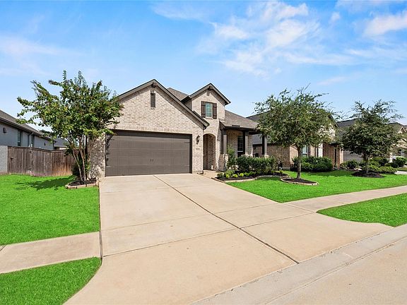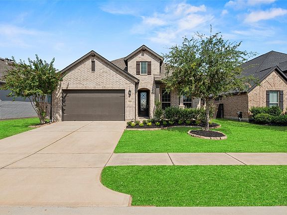 Welcome to this stunning Highland Home nestled in the master-planned community of Cane Island. This beautifully designed one-story residence features an open concept layout with abundant windows that flood the space with natural light. The family room boasts a cozy stone gas fireplace and custom lighted built-ins, creating a warm and inviting atmosphere. Gorgeous wood flooring flows throughout the home, with tile in all wet areas. The bright white kitchen is a chef’s dream, offering plenty of counter and cabinet space, sleek Silestone countertops, and a stylish ceramic tile backsplash. The master suite is a true retreat with bay windows, double vanity sinks, and an oversized walk-in closet. Step outside to enjoy the covered patio—perfect for relaxing or entertaining. Additional upgrades include whole home gutters and a recently installed whole home generator, ensuring comfort and peace of mind year-round. This home combines elegance, functionality, and thoughtful details throughout.