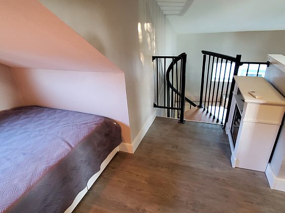 Electric fireplaceGas stoveApartment size refrigeratorWork deskSpiral staircaseKeurig coffee machinePrivate entrance