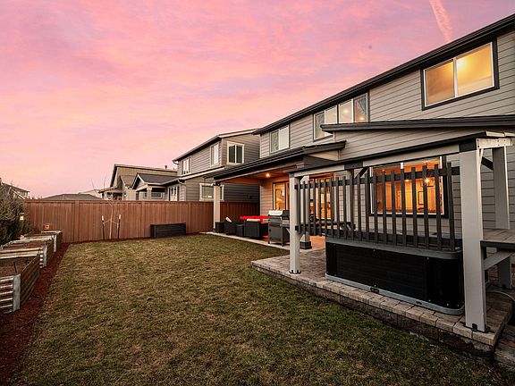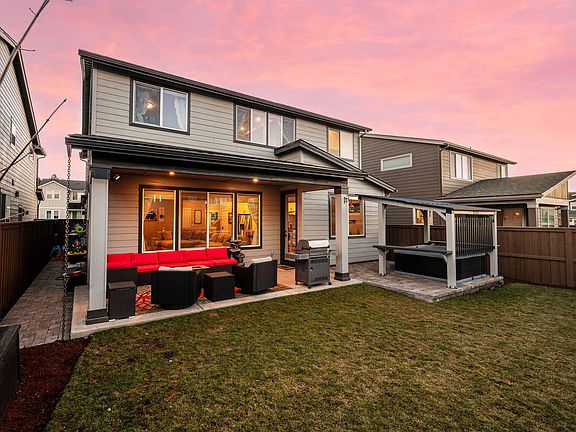 Welcome to modern luxury living in Petrosa. This contemporary two-story home was constructed in 2022 by Pahlisch Homes. Step inside to find a versatile den space before entering the beautifully designed open kitchen, dining and living space ideal for entertaining. Throughout the home custom Graber blinds adorn every window. Upstairs the spacious primary suite boasts a free-standing soaking tub, dual vanity, walk-in closet, and glass-enclosed shower. The garage has been thoughtfully upgraded with functional enhancements, including an epoxied floor, overhead storage, equipment racks, and custom cabinets. Venture to the backyard where you'll find a covered patio overlooking lush grass, raised garden beds and paved areas for the hot tub and pergola. Neighborhood amenities include a pool, spa, fire pit, BBQ areas, and playground. Enjoy close proximity to Pine Nursery Park with walking paths, dog park, sports fields and pickleball courts. Discover the charmed living this home can offer!