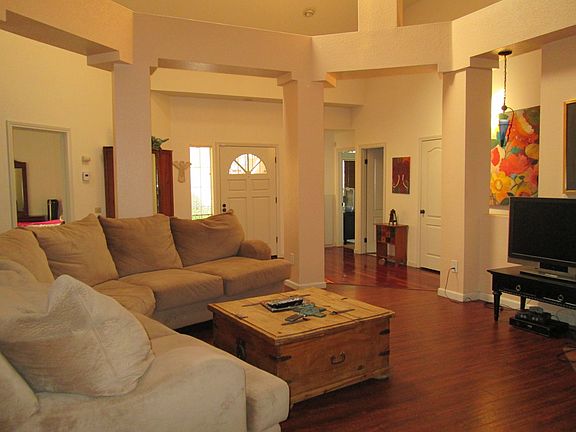 Available April 1st Single story 3 bedroom 2 bath home on a corner lot features open living room with hardwood flooring, gas fireplace, separate dining room. Carpet is only in the two secondary bedrooms, kitchen has lots of cabinet space and refrigerator is included. Garage has ample cabinet space for storage. Pool service is included, tenant is responsible for landscaping. One pet is allowed with pet deposit.