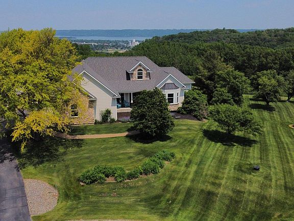 Gorgeous lakeview property! Enjoy this country setting with all the amenities! Beautifully maintained and updated property with over 2 acres, in-ground lawn sprinkler, in an established community, and in a cul de sac! Beautiful open concept with gourmet kitchen that opens up into dining area and sunroom with fireplace! Sunroom walks out to maintenance free grilling deck that overlooks Lake Pepin and backyard patio! Hardwood floors throughout as well as in-floor heat and multiple fireplaces. Private master suite with walk in closet, wood accent wall, walk in tiled shower and jetted tub. 2nd bedroom located on the main floor as well as a living/piano room with wood fireplace and gorgeous views of the lake! Fully finished basement with in-floor heat, fireplace and surround sound for all of your movie or sports nights! Spacious family room, wet bar, exercise room, full bath, 2 bedrooms and full bath! Walk out into the enclosed screen porch with teak wood flooring - perfect for coming in from the hot tub and flagstone patio area! Enjoy the 1,000 sq ft patio with built-in gas firepit! Extend your enjoyment of this beautiful property in the full detached man cave!! Man cave is fully equipped with golf simulator, dry bar with indoor-outdoor bar, maintenance free deck overlooking the lake, gaming center with multiple options, linear gas fireplace and surround sound! Upstairs loft area has multiple uses! Heated workshop tucked in the garage under the mancave! Separate heating and cooling systems then home! Beautiful property to entertain in, or just enjoy all to yourself! Don't miss out on viewing this beautiful property!