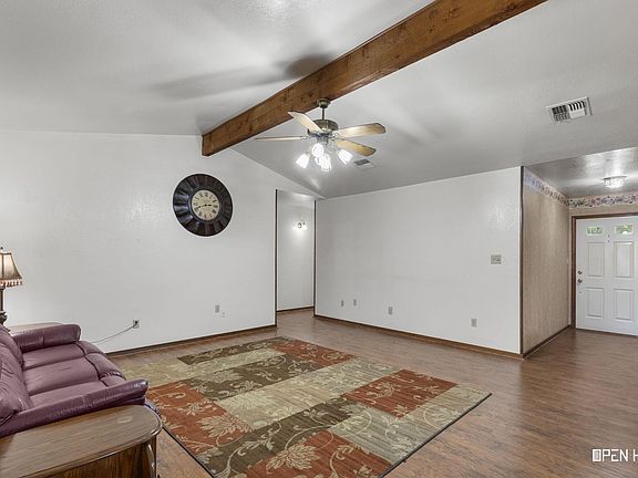 Spacious & well maintained 3 bedroom, 2 bath, 2-car garage home. Living room has vaulted & beamed ceiling. Dining area has bay window. Kitchen has breakfast/serving bar, electric oven & cooktop, built-in microwave, & dishwasher. Laundry room. Primary bedroom has walk-in closet & en suite bath w/tub/shower combo. Bedrooms have good sized closets. Large hall bath has dual sinks & tub/shower combo. Privacy fenced backyard has 2 outbuildings, one w/electricity. Circle front drive.