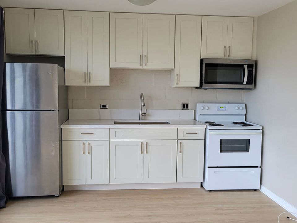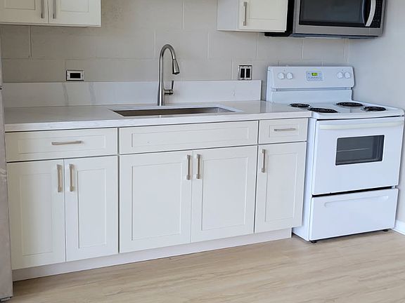 Kitchen cabinetsVinyl plank flooringQuartz countertopMicrowave hood