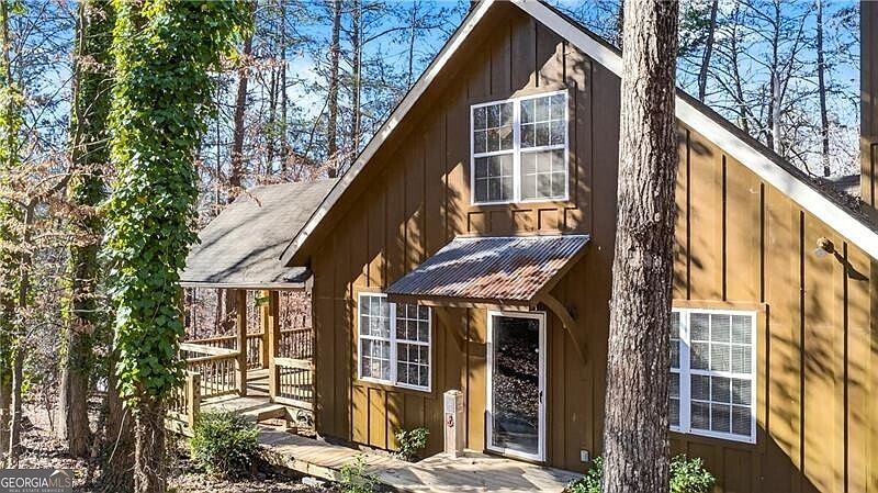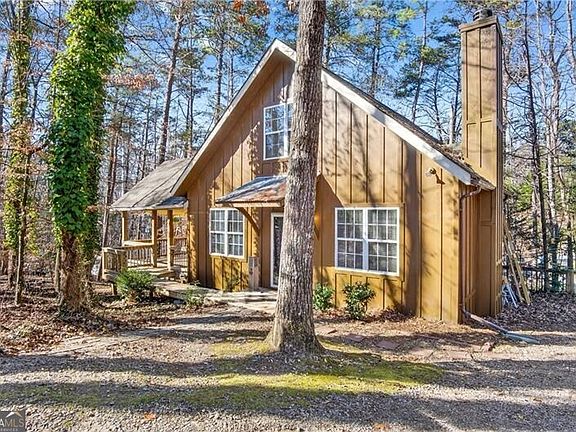 Move-in ready cottage in "A Quiet Place in the Woods" neighborhood, steps from community dock & boat launch on Lake Lanier! Wooded cul-de-sac lot has extra back driveway - ideal for private boat storage - leading directly to the n'hood amenities area. Built in 2008, this could be a dynamite primary or vacation/investment home. Main level great room, eat-in area, & kitchen are all open to each other. Awesome 16' x 16' covered side deck/porch w/hanging canoe decor is THE place to enjoy morning coffee and evening beverages...and don't miss the fire-pit beyond the porch for those late night endeavors! Large walk-in cellar/crawl space provides plenty of storage w/full access to systems & structure. Real hardwood floors on main level; stacked stone fireplace w/bookshelves; nice stained upper & painted lower cabinets in kitchen, along with stainless appliances & white bead-board backsplash; insulated windows; large laundry room on main level. One BR & BA on main, two BR & full BA up - excellent roommate plan. HVAC system replaced in 2024, water heater replaced in 2023. Laid-back neighborhood is gated, and includes public water & sewer, boat docks, boat storage, clubhouse, pool, tennis courts, street lights, and more. All this in a serene lake setting, yet still close to civilization and downtown Gainesville. Easy lake living at a great price!