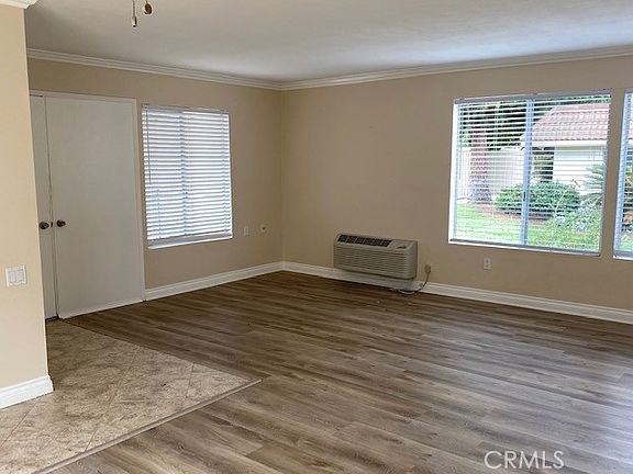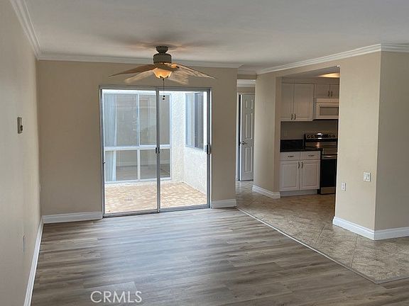 Laguna Woods is a 55+ Community .....Highly sought after bungalow style, single level Villa Nova plan. Your spacious 2 bedroom and 2 bath condominium features a huge tiled and gated patio with storage closets, double door entry and sliding glass doors to the primary suite. Smooth ceilings, luxury vinyl floor and tile throughout (no carpet), neutral paint, crown molding and nice baseboards. The kitchen was upgraded with white cabinets, granite slab counters, microwave, dishwasher, refrigerator and NEW Samsung stainless steel smooth top range. INSIDE LAUNDRY WITH WASHER/DRYER INCLUDED. The great room is large and has plenty of light and opens to a nice dining room and the atrium which offers more outdoor living space. Primary suite not only has a slider to the patio, it has its own bathroom and air conditioner/heater. The secondary bedroom has great closet space and ample light from the charming central atrium as well as access to the hall bathroom. Conveniently located off gate 7 close to shopping and much more!