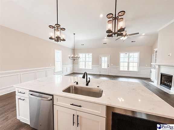 Gas log fireplaceSpacious kitchenFamily roomEngineered hardwood flooringOversized work islandTasteful tileLarge covered rear porch