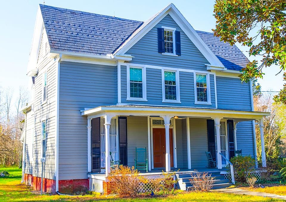 Family roomMud roomSlate roofLarge libraryArchitectural detailsPeaceful acreageRocking chair front porch