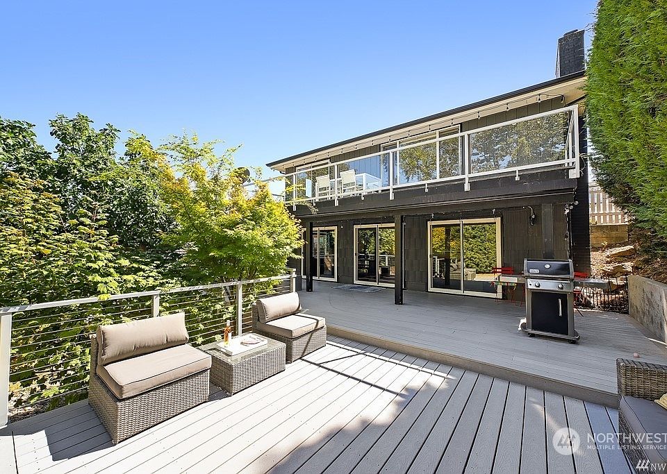 Midcentury Modern design with numerous upgrades. Beautiful light-filled updated kitchen with marble counter-tops, tile back splash, newer cabinets, and high end appliances. Large entertaining deck off of main floor living, dining and kitchen area with seasonal city views. Hardwoods and ceramic tile flooring throughout. Wonderful finished daylight basement perfect for media, game or exercise that opens to fully fenced, spacious private backyard with covered deck and patio. Plenty of room for recreation or large gatherings! Spacious flat driveway and attached garage. Tons of storage! Ultra-convenient location minutes to restaurants, Alki beach, Alaska Junction, and bus line. Old Republic Home Protection warranty included.