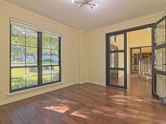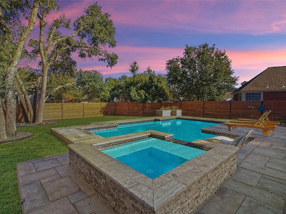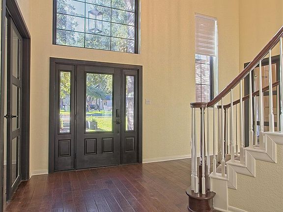 Welcome to your private paradise! This Forest Ridge gen is an entertainer’s dream nestled on almost 1/2 an acre that boasts beautifully landscaped grounds including a heated swimming pool and hot tub designed for year round enjoyment. Whether you're shooting hoops or spiking volleyballs, the basketball/volleyball court is ready for action. And for the fastest-growing sport in America, envision your very own custom pickleball court, which could easily be added to this dual sports court. With an outdoor lounge area including covered deck and outdoor fire pit area and bones for your outdoor kitchen, you can finish out the design and selections if you so desire. The property offers a detached, three car garage and home is fully gated with an electronic entry system. Step inside to find elegant wood floors throughout the main level, complemented by travertine tile in the updated kitchen. Custom cabinetry, granite countertops, a walnut butcher block center island, double oven, and a farmhouse sink make this kitchen a chef's dream. Kitchen seamlessly flows into the living area, featuring a marble-framed fireplace. The downstairs master suite features a dual vanity, walk-in shower and spacious closet with custom built-ins. Upstairs, a generous bonus loft space and three bedrooms await, two of which share a jack-and-jill bath. Home is equipped with Andersen Windows throughout; all walk-in closets customized with California Closets and separate a/c units for each floor. Mature trees and fencing create a serene, secluded atmosphere—welcome to paradise.