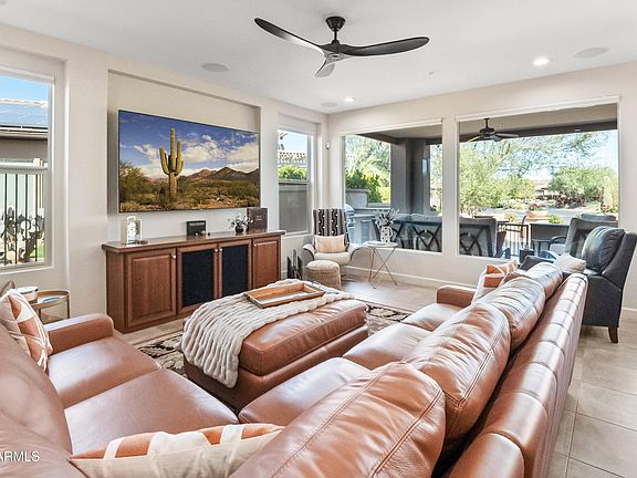 Welcome home to this beautifully designed 3 bed/2.5 bath with extended 2 car garage. This home boasts a spacious open floor plan that is perfect for both relaxation and entertaining. The gourmet kitchen is a chef dream with ample storage and pull-out lower cabinets, custom built in refrigerator and recently installed granite and backsplash. Escape to the spa like oversized primary bedroom and bath. The primary walk-in closet includes a convenient pass-through to the laundry area, making life that much easier. The 3rd bedroom comes with a custom built in desk, ideal for home office or study space. Included in this stunning home is a built in custom wet bar and den. The backyard is an oasis excellent for entertaining guests or a private escape for that perfect morning coffee Additional upgrades include central vac, remote controlled blinds, a recently remodeled guest bath, a scrubber ventilation system to purify the indoor air. In the outdoor kitchen you will find a new built in refrigerator. This home is truly a blend of luxury and comfort in a prime location in Trilogy at Vistancia.