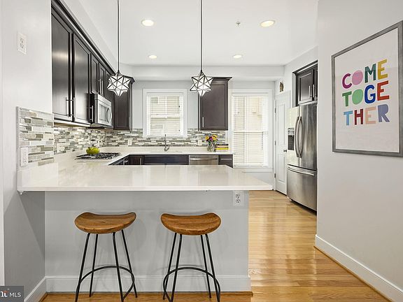 Fresh and updated LEED Certified rowhome in Chancellors Row, offering 3 BEDROOMS w/ 3 ENSUITE BATHS plus a powder room on the main level, new gleaming QUARTZ COUNTERS in the kitchen, new HVAC, GARAGE PARKING, 2 FLEX SPACES + YOUR OWN PRIVATE ROOFTOP PATIO. Enter into your spacious foyer with gleaming hardwoods and ample space for coats and shoes. Just off the foyer, step into your living and dining area flooded with natural light and end-to-end hardwood floors. You will absolutely love this main level with an open flow dedicated to dining and living - perfect for entertaining. Your kitchen features contemporary cabinetry, stainless steel appliances, updated backsplash, a pantry, and sparkling quartz countertops with a wrap-around eat-in counter. Upstairs, you will enjoy gorgeous hardwood flooring throughout the bedrooms and hallway, 2 bedrooms including a primary suite and guest suite, a laundry room, and spacious linen closet. Your primary bedroom features a recently renovated ensuite bathroom with dual sinks and a steam shower. Down the hall from the primary bedroom is a sun-filled guest suite with ensuite bathroom. Up the stairs to the top floor, you will enjoy a flex space ideal for working from home or hosting guests, a spacious bedroom, full ensuite bathroom, and a private roofdeck with exquisite sunset views. Moving downstairs to the lower level, you will enjoy another spacious flex room, and your privately connected garage. The Chancellors Row community features ample green space and guest parking. Easy access to 2 metro stations, metrobus stops, and steps to trendy restaurants and shops in Brookland, a biking and running trail, close proximity to MedStar and Children’s National hospitals, and so much more. Move-in ready for the next owners!