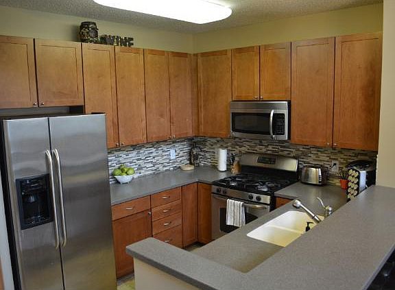 Beautiful and Spacious Unit with 2 Story Ceilings. Upgraded 42' Birch Cabinets, SS Appliances, Corian Counters, Backsplash, Hardwood floors, Travertine Tiled Kitchen and Powder Bath on Main. Large Master Bedroom with His/Hers Closets. Built in loft.