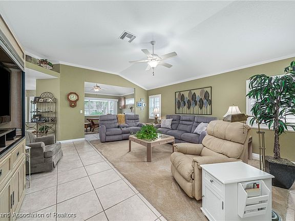 Come and see this home in the sought after active community of Highlands Ridge. Enter this fully furnished home with 10' ceilings in the entry way and living room. Split floor plan offers privacy for guests and owners. 3 Bedrooms, 2 bathrooms, plus a bonus game room with entry to the rear partially covered screened porch. Plantation shutters in most of the rooms. The kitchen is located in the center of the home open to the living areas. It has solid surface counters, white cabinets and appliances. The large owners suite has 2 walk-in closets as you enter the on suite bathroom with double sink vanity, step in shower, and water closet. Convenient inside laundry room. Additional features include a whole house Generac that provides continuous power in storms installed in 2020. New roof and a/c in 2022, new hot water tank in 2021, and an irrigation well for watering the lawn. Close to the community center clubhouse and one of the pools, shuffleboard and bocci ball. Also available is tennis, pickleball, 2nd pool, and golf courses. Iincluded is a 2018 Ezgo Golf Cart.