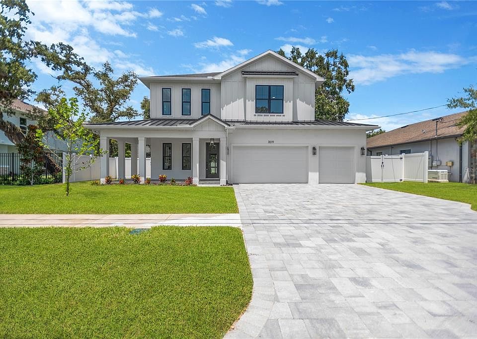 Move-in ready new construction in a prime South Tampa location! This beautifully designed 5-bedroom, 4-bathroom home with a 3-car garage offers 3,025 sq. ft. of luxurious living space, with large covered lanai over looking expansive backyard on a oversized lot (70x118) with plenty of room for a pool. Showcasing timeless curb appeal, the home features a charming wrap-around front porch, paver driveway, St Augustine sod with irrigation system, vinyl fencing and elegant architectural details. Inside, you’ll find 10’ ceilings and 8’ doors on both levels, Impact hurricane windows, Trane HVAC system, smooth finish drywall, wide-plank engineered hardwood flooring throughout (tile in wet areas), drop zone with cubbies, built in closets and tray ceilings with integrated lighting. The open-concept main living area includes a built-in electric fireplace, dining room, and a designer kitchen with shaker-style cabinets to the ceiling, quartz countertops, GE stainless steel appliances, an electric cooktop, built-in oven/microwave combo, and a spacious walk-in pantry. A first-floor bedroom or office and a full bath with shower add flexibility and function to the main level. Upstairs, the expansive primary suite offers dual walk-in closets and a spa-inspired bath with a freestanding soaking tub, frameless glass shower, double vanity, and private water closet. The second floor also features a large en-suite bedroom with a walk-in closet, two additional bedrooms sharing a full bath, a loft with a built-in wet bar and mini fridge, and a well-appointed laundry room with custom cabinetry, quartz counters, and a sink.