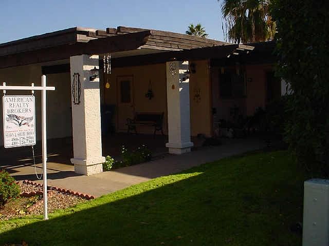 Great 3 bedroom 2 bath patio home overlooking grassy common area & community pool. Updated stove and microwave, ceiling fans throughout. Spacious floorplan with 10x9 1/2 room addition used as office leading to private outside covered patio addition. Storage Shed conveys 'AS IS'. Sliding door off master bedroom. Front two doors with Security doors off Livingroom and Kitchen. Great investment for buyer wanting to finish some minor upgrading. Addition & covered patio no permits needed, had HOA approval. Call lister with any questions. 602-819-1123. Show and Sell!