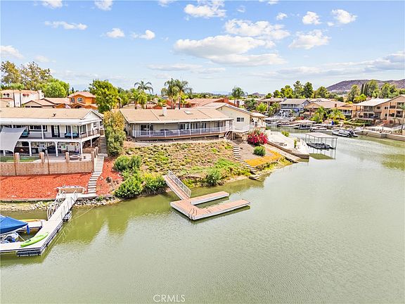 Enjoy true waterfront living in this rare 3-bedroom, 2-bath home situated on a generous pie shaped lot at the end of a quiet cul-de-sac. This single-story gem boasts a private boat dock and a spacious wrap around deck overlooking the water perfect for relaxing mornings and stunning sunsets. Inside, soaring vaulted wood-beam ceilings and a skylight create an open, airy feel. Floor-to-ceiling glass sliders flood the living space with natural light and provide seamless access to the deck and lake views. A dramatic stone fireplace anchors the great room, creating a cozy focal point. The kitchen is designed for entertaining and daily living alike, featuring stainless steel double ovens, a cooktop facing the living area, a large breakfast bar peninsula, and a pantry with pull-out shelving. Charming details like a garden window over the sink and stone accented breakfast bar add character. The master suite is a lakeside retreat with vaulted ceilings, a ceiling fan, and private deck access. Its en-suite bath includes a soaking tub, separate walk-in shower, dual sinks, and ample storage. Two additional bedrooms also offer vaulted ceilings and ceiling fans, with one providing private deck access and a walk-in closet. Step outside to your private boat dock and a terraced backyard stretching to the shoreline, perfect for water activities or creating a resort-like outdoor space. The attached 2-car garage and extended driveway provide ample parking for vehicles and guests. Living in Canyon Lake means access to resort-style amenities like a private lake for boating, fishing, swimming, an 18-hole golf course, tennis and pickleball courts, Olympic-sized pool, parks, playgrounds, and a vibrant social community. The home’s location near the East Gate offers quick access and nearby community features such as the dog park and sports courts. 30199 Windward Drive is more than a home it’s a lifestyle. Don’t miss this rare opportunity to own a waterfront oasis in one of Southern California’s most sought-after gated communities.