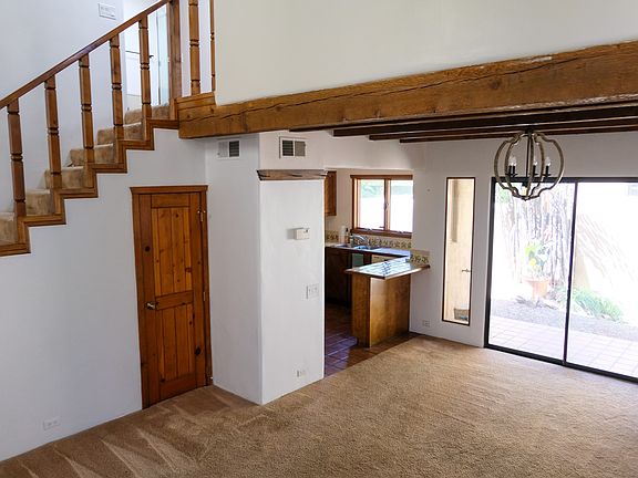 This 2-bedroom, 2.5-bathroom residence boasts a warm and inviting atmosphere, highlighted by exquisite woodwork and iconic viga ceilings. Enjoy cozy evenings by not one, but two wood-burning kiva fireplaces—one in the living area with soaring ceiling, and the other in the primary suite. Bedrooms are both upstairs. A balcony off the second bedroom invites a blend of indoor/outdoor living. Flowing condo association owned common space pairs well with an enclosed private backyard, ideal for modest gardening or alfresco dining. An attached, direct entry, one-car garage will keep you car or your hobbies out of the elements. This is a great opportunity to own a piece of Santa Fe's rich architectural heritage, with all the cultural and culinary delights of downtown within easy reach.