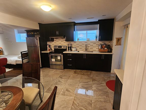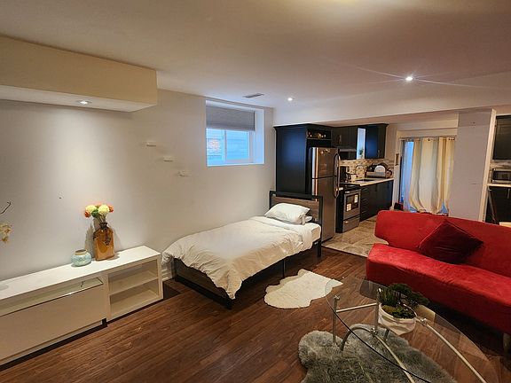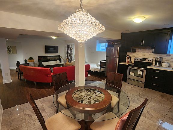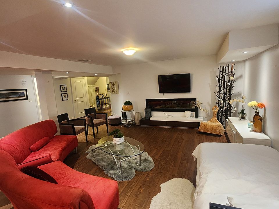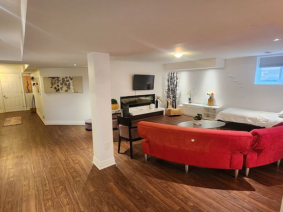 This spacious and beautifully designed basement apartment offers over 1,000 sq. ft. of bright and comfortable living space. Featuring large windows in every room, including the living area, it's filled with natural sunlight throughout the day. The unit boasts high ceilings, vinyl and tile flooring, and a huge living room with a cozy fireplace, perfect for relaxing or entertaining. The kitchen is generously sized with a full dining area and comes equipped with all appliances, plus your own in-unit laundry for added convenience. With two private entrances and two parking spots included, this is not your typical basement as it's large, modern, and inviting, truly feeling like home.