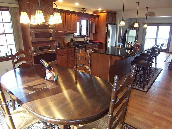 Waterfront home on private Beaver Lake. This over-sized chalet has lots of updates. Remodeled kitchen with granite countertops, oversized granite island, newer cupboards, recessed lighting, and stainless steel appliances .Main floor has oak wood flooring and 5 sliders. Living room features 3 sliders, oak wood floor, ceiling fan, propane free standing stove w/ remote control and beautiful view of lake. Office on main floor w/ slider and hardwood floors. Dining room w/hardwood floors & slider overlooking back yard w/fruit trees/bushes. All three bedrooms on second floor. Large master bedroom w/wall-to-wall carpeting, bow window w/lake views, nice wood cathedral ceiling, 2 closets & newer skylight. Two bedrooms with wall-to-wall carpeting and closets. Family room on lower level with built-in shelving, closet and overlooking lake. Vinyl sided home with clog-free gutters. Over-sized deck over looking lake. Newly installed well water tank. Generator ready. Shed w/electricity.