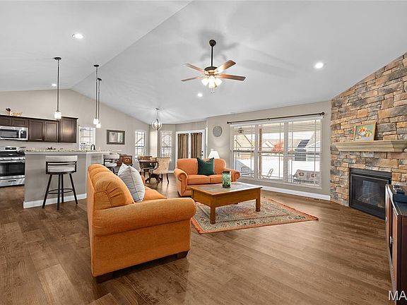 Located within the Villages of Wingate and the Mascoutah School District, this impeccably maintained corner home offers convenient proximity to a walking path, playground, Metro East bike trail, and Wingate Elementary. The residence features numerous enhancements, including granite countertops, vaulted ceilings, a contemporary-rustic fireplace, coordinated GE stainless steel kitchen appliances, Maytag washer and dryer, engineered wood flooring throughout, ceramic-tiled bathroom floors, marble window sills, and abundant natural lighting.