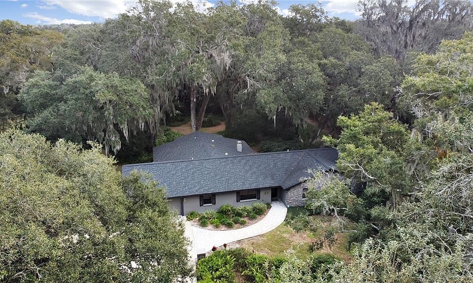 Welcome to this Charming Home with 3 Large Bedrooms and 2 Baths situated on a Serene Park Like 6 acre lot. Offering a 2 Car Oversized Attached Garage, 2 Car/Boat Covered Parking, plus a 4 Car Block Detached Garage (1200 Sq. Ft Built in 2002) with a Pull Through, this home has a ton of storage. This property Zoned ASC-1, offers a unique blend of comfortable living, practical amenities, and many possibilities. The front 3 acres host this one owner home. The back 3 acres of breathtaking vacant land with a small creek, has a separate folio, opening exciting opportunities for exploring agricultural ventures, pasture, or a family estate. The home itself features a gorgeous Sunroom addition from 2002, adorned with large glass windows that offer panoramic views of the beautifully landscaped backyard along with lots of natural light. Another great feature added in 2002 is a large walk in saferoom equipped with a Ft Knox Vault Door, providing both security and peace of mind. For additional security the property is equipped with closed circuit cameras and an alarm system with cellular backup. Inside the open floorplan creates a welcoming atmosphere, with a dining and formal living room combination in the front. The kitchen, with bar seating, is open to sunroom and offers perfect casual dining with a beautiful backdrop of the backyard. The roof was replaced in 2019 with dimensional shingles, and the AC was upgraded in 2023 to a Trane heat pump, ensuring modern comfort and energy efficiency. Mature landscaping and majestic oak trees surround the property, adding to its natural beauty. The interior has been freshly painted, giving the home a bright and inviting feel. Super Convenient Location to both I-4 and I-75. This property is not just a home; it's a canvas for your dreams and aspirations. Come take a look for yourself!