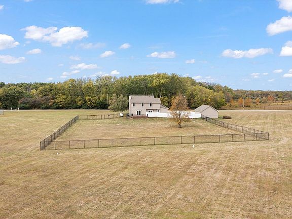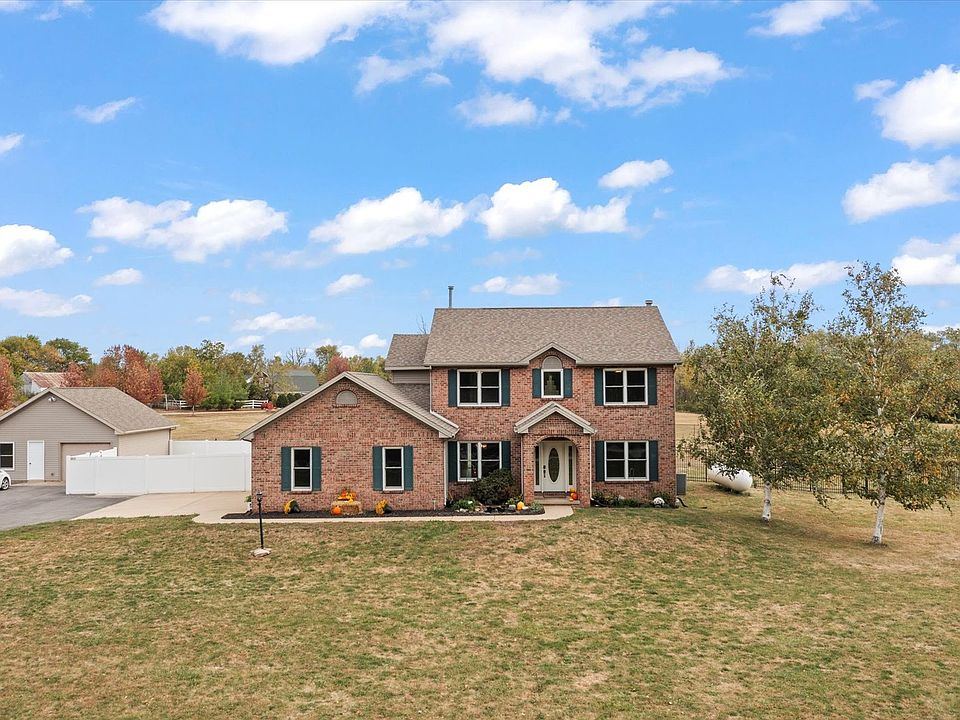This stunning 4-bedroom, 2-story brick-front home sits on nearly 12 beautiful acres, offering the perfect blend of comfort, space, and privacy. The upper level features three spacious bedrooms, a full bath, and a luxurious primary suite with vaulted ceilings, a walk-in closet, and an en suite bathroom complete with a jacuzzi tub, separate shower, and double sinks. The main floor boasts a welcoming living room, formal dining room, a well-appointed kitchen that opens to a bright breakfast area and cozy family room with a fireplace, plus a full bathroom for added convenience. The full basement provides a large recreation room, a full bath, and abundant storage space. Outside, enjoy a fenced-in area, expansive concrete patio with privacy fence, a relaxing back deck overlooking the property, and both an attached and detached garage for all your vehicles and equipment. The detached building has a large finished room on one side, with space for a car and/or equipment on the other. The 6 ft high chain link fence encloses a sizable area off the back of the house creating a private park all of your own. This property offers the perfect country retreat with modern amenities and endless possibilities.