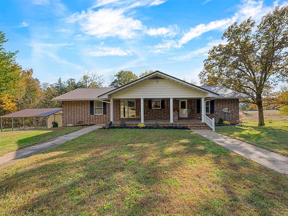 This custom-built brick home sits on 21.73 mostly wooded acres that provide a secluded and private setting and offers over 3,350 sq. ft. of living space. The main level features 3 bedrooms and 2 baths, while the full basement includes 1 bedroom, 1 bath, and a large two-car garage. The home has been freshly renovated throughout with new flooring, granite countertops, a tile backsplash, new kitchen appliances, and a walk-in pantry. All bathrooms have been updated with new finishes and granite counters. Interior features include a formal dining room, an eat-in kitchen, a large living room with a fireplace/heatolator, and a den with a second fireplace/heatolator. The master suite offers double vanities and a walk-in shower. The home also has new central heat and air. Large covered front and back porches overlook the surrounding woods and are ideal for enjoying the peaceful country views and abundant wildlife. The property includes a 24×30 shop with concrete floors and electric, a 36×84 barn, and a 20×22 carport for additional covered parking.