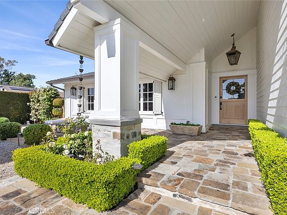 Enjoy a resort-style backyard with a pool, jacuzzi, fireplace, and multiple entertaining areas surrounded by mature hedges and gardens. Additional highlights include a custom barn-style garage door, Dutch front door, and elegant stone hardscaping.