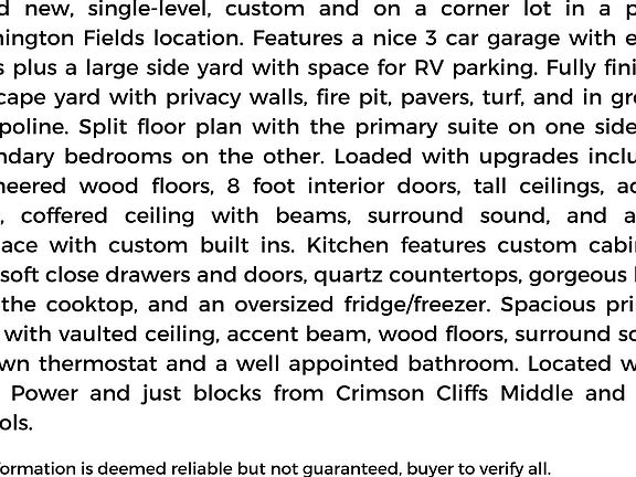 Brand new, single-level, custom and on a corner lot in a prime Washington Fields location. Features a nice 3 car garage with epoxy floors plus a large side yard with space for RV parking. Fully finished xeriscape yard with privacy walls, fire pit, pavers, turf, and in ground trampoline. Split floor plan with the primary suite on one side and secondary bedrooms on the other. Loaded with upgrades including engineered wood floors, 8 foot interior doors, tall ceilings, accent walls, coffered ceiling with beams, surround sound, and a gas fireplace with custom built ins. Kitchen features custom cabinetry with soft close drawers and doors, quartz countertops, gorgeous hood over the cooktop, and an oversized fridge/freezer. Spacious primary suite with vaulted ceiling, accent beam, wood floors, surround sound, it's own thermostat and a well appointed bathroom. Located within Dixie Power and just blocks from Crimson Cliffs Middle and High Schools.
