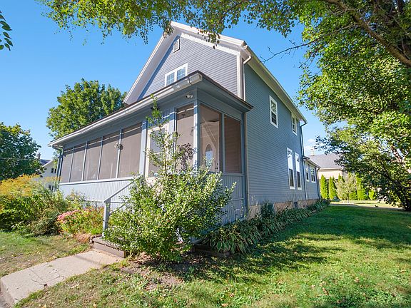 Welcome to this beautiful home in the heart of Elgin, perfectly situated on a corner lot. Enjoy your morning coffee or relax on the wraparound enclosed front porch. As you step inside, you will be greeted by gleaming wood laminate flooring and an open floor plan. The living room features white trim, built in cabinets and a brick fireplace, creating an inviting atmosphere for relaxation and entertainment. The dining room is equipped with wood laminate flooring, white trim, can lighting, and a fan. Bright and sunny kitchen features many cabinets, counter space, and an island. Mudroom off the kitchen is perfect for additional storage. Main floor bedroom has wood laminate flooring and beautiful french doors. The full hallway bathroom completes the main level. Upstairs you will find 2 nice size bedrooms both featuring hardwood flooring. 1 bedroom includes a walk-in closet and the other bedroom offers a bonus room, that is perfect for an office, playroom, or walk-in closet. Full hallway bathroom on the 2nd floor. Full basement with lots of space for storage. Newer windows throughout the main and 2nd floor of the home. Sprawling backyard features a large patio, perfect for entertaining. 2 car detached garage currently being used for storage, but has potential to be converted back. Don't miss this opportunity to own a meticulously maintained home. Schedule your private showing today! Property sold as-is.
