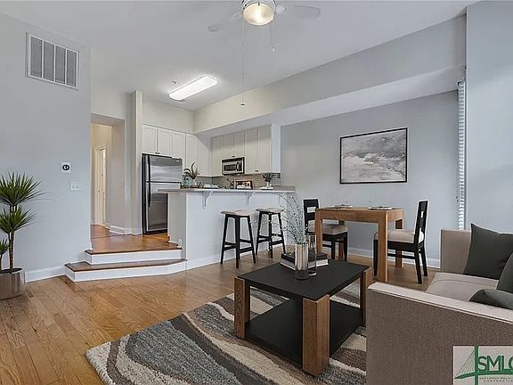 Experience the best of Savannah living with this modern 2 bedroom, 1 bath condo. The primary bedroom includes a large walk-in closet, 2nd smaller bedroom could be used as an office. Located on the West side of Savannah's Historic Landmark District, it is ideally situated within walking distance to the world-famous Forsyth Park, local restaurants, coffee shops, and pubs. Its open floor plan, stunning wood flooring throughout, and a sunken living room create a stylish retreat of comfort and sophistication including High ceilings and lots of natural light, The stylish kitchen includes stainless steel appliances, subway tile backsplash, and ample prep space. Combined with private and gated off-street parking, this condo is ideal for those seeking a modern lifestyle in a historic setting.