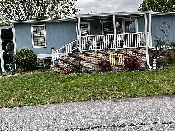 Manufactured Home in the desireable community of Cumberland Village. This is an active 55+ community where you own your own lot- no lease fee. HOA fee of $150 per month includes lawn and pool maintenance as well as trash pickup and community upkeep. Home has been updated with LVP floors throughout, granite countertops and easy walk-in shower. Newer roof (3 years) and brand new HVAC unit. Rocking chair front porch and paver back patio with small pet area. All season sun room allows additional living space not included n total square footage of home. Split bedroom plan and indoor laundry room. Nice sized storage shed and carport complete this cozy home. Community pool and clubhouse included in HOA fee. Convenient to everything Hendersonville has to offer. No flooding from Helene.