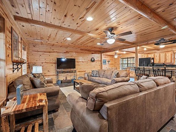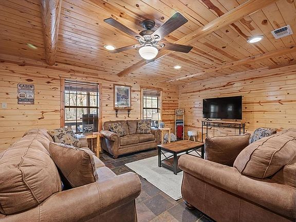 Lost Woods Lodge is sure to be a hit with guests looking for a traditional feeling cabin that has a private feel and great location. Situated near popular dining in the heart of Hochatown, yet on a wooded lot giving that cabin in the woods feel. Step inside to the open layout where gathering is a breeze. Plenty of seating in the living room for the whole crew and pull-out couches provide added sleeping space. Gather around the island with seating for 3 and a dining table that serves up to 6. A laundry room located off the kitchen for easy access. On the main level guests will find a King bedroom with ensuite bathroom. A half bath provides convenience for all guests. Upstairs is another King bedroom, a bunk room with 2 twin bunks featuring a reading nook, and a shared full bathroom with tub shower combo. Step out on the spacious covered porch, hang out on the open deck and relax, grill, or soak in the covered hot tub. A few steps away is a fire pit under the stars and surrounded by chairs with built in drink holders. For a little friendly competition head over to the horseshoe pit. A circle drive allows for easy access especially while pulling the boat or ATVs. Located near Gutter Chaos, Girls Gone Wine, Blue Rooster, and Grateful Head Pizza!