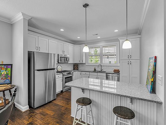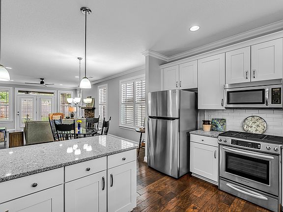 This beautifully maintained home is move-in ready and waiting for you to make it your own. The charming front porch welcomes you to sit back and enjoy your morning coffee or an afternoon drink in comfort. Inside, the entire home has been freshly painted, creating a clean and inviting atmosphere. As you enter, you'll love the open floor plan, highlighted by elegant plantation shutters, gleaming hardwood floors, and French doors that open to the outdoor living space. The chef’s kitchen is a true centerpiece, featuring quartz countertops, stainless steel appliances, and a spacious island with bar seating—perfect for casual dining or entertaining. The cozy fireside family room offers the ideal space to relax and unwind. The primary suite is conveniently located on the main level and boasts a luxurious en-suite bathroom with dual vanities, a garden tub, and a large tiled shower. Two additional bedrooms and a full bathroom are also located on the main floor. Upstairs, you’ll find a spacious flex area with a large closet—perfect for a home office, guest room, or additional living space. Outside, enjoy a covered patio area and a beautifully maintained yard, perfect for outdoor gatherings or quiet relaxation.