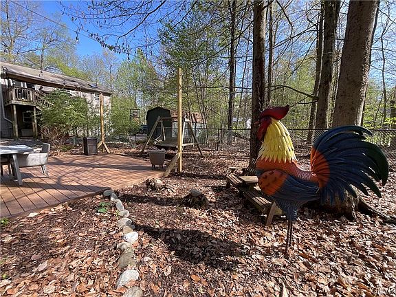 Unwind in your backyard oasis featuring a hot tub, firepit, raised garden beds area for the amateur gardener, and 2 outdoor dining spaces complete with bistro lights and a sun shade for those hot summer days. Whether you want an AirBnB, second home, or primary home, this fully furnished, modern home is perfect for large families, offering a large game room for kids or large gatherings with a bonus room/office and full bath downstairs, and 3 bedrooms, 2 full baths upstairs. Nestled in a tranquil neighborhood with no HOA on a private wooded lot of 1.22 acres, it's conveniently close to stores, Kalahari, Camelback, Mt. Airy Casino, ATV parks, and highways. The property includes 2 deep garage bays for vehicles, toys, or a workshop, along with a sizable shed for tools and additional storage.