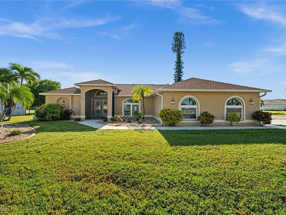 ACCESSIBLE POOL HOME ON A CORNER LOT! Welcome to this thoughtfully designed Cape Coral home offering comfort, accessibility, and Florida lifestyle living. This 3-bedroom, 2-bath residence sits on an oversized lot of more than .25 acre and features a spacious open layout with vaulted ceilings. The kitchen includes stainless steel appliances, a breakfast bar, crown molding, a tile backsplash, and a coffee bar with beverage fridge. The living area opens through impact sliding doors to a large screened lanai and inviting pool surrounded by pavers, perfect for entertaining or relaxing outdoors.
