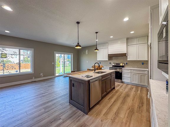 Welcome to a home where thoughtful design and quality craftsmanship create a space that truly feels like home. Built by Behr Construction known for lasting value and functional floor plans, this residence blends timeless style with modern comfort. The open-concept main level greets you with tall ceilings, natural light, and a seamless flow ideal for everyday living or entertaining. At the heart of the home, the chef-inspired kitchen features tall, soft-close cabinetry, full-extension drawers, a spacious island perfect for gathering, and a generous walk-in pantry to keep everything organized and within reach. With over 1,650 sqft on the main level and an additional 1,000 sqft of beautifully finished space below, there's room to grow through every stage of life. The layout includes 2 bedrooms and 2 baths on the main floor, including a relaxing primary suite, plus 2 bedrooms and a full bath downstairs, ideal for guests, kids, or a home office. The finished lower level adds a wet bar and open space for connection or entertainment. Located within walking distance of Prairie Trail's parks, schools, pickleball courts, trails, and The District, this home offers more than exceptional design it delivers a lifestyle of convenience, community, and comfort. Every detail reflects Behr's commitment to making life feel right at home.