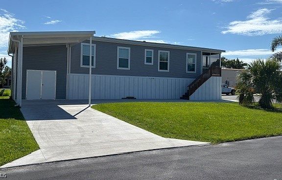New 2024 elevated manufactured home located across from the Orange River with access to the Caloosahatchee River, the intercoastal and the Gulf, offering boating, fishing or simply relaxing on the porch with Views of the pool and water. That’s what retirement living is all about! This 1,268 sq ft. home has an attached 270 sq foot porch. The home is a two bed/two bath featuring an open concept living space with sliders providing access to the porch; a spacious kitchen with an island, The master bedroom features two large closets; master bath has shower and sink. The guest bathroom also has a tub. The home is being sold with the furnishings. Price includes share for the lot and ownership in the community with a low monthly maintenance fee of $406, which includes water/sewer, lawn care, trash pickup and fiber optic internet and all the amenities in the community to include heated pool, large clubhouse, two boat ramps, a community fishing pier, two pickleball courts, bocce, horseshoes, shuffleboard and so much more. Orange Harbor is a 55+ waterfront, pet-friendly community close to downtown Ft. Myers, the Manatee Park, restaurants and shopping. Orange Harbor allows for up to two pets, some dog breeds are not allowed, so be sure to review the rules. ESA animals are allowed.
