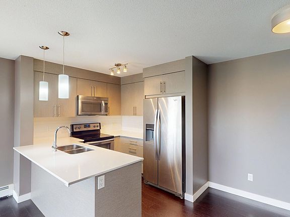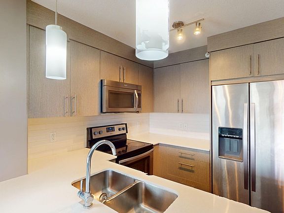 Top corner condo unitCork flooringBeautiful tileSleek white quartz countertopsStainless appliancesWhite subway backsplashAdditional windows