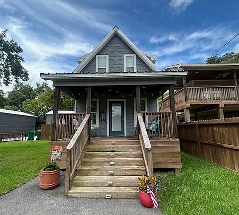 Two patios with seatingFront patioLarge fully fenced yardView of galveston bay
